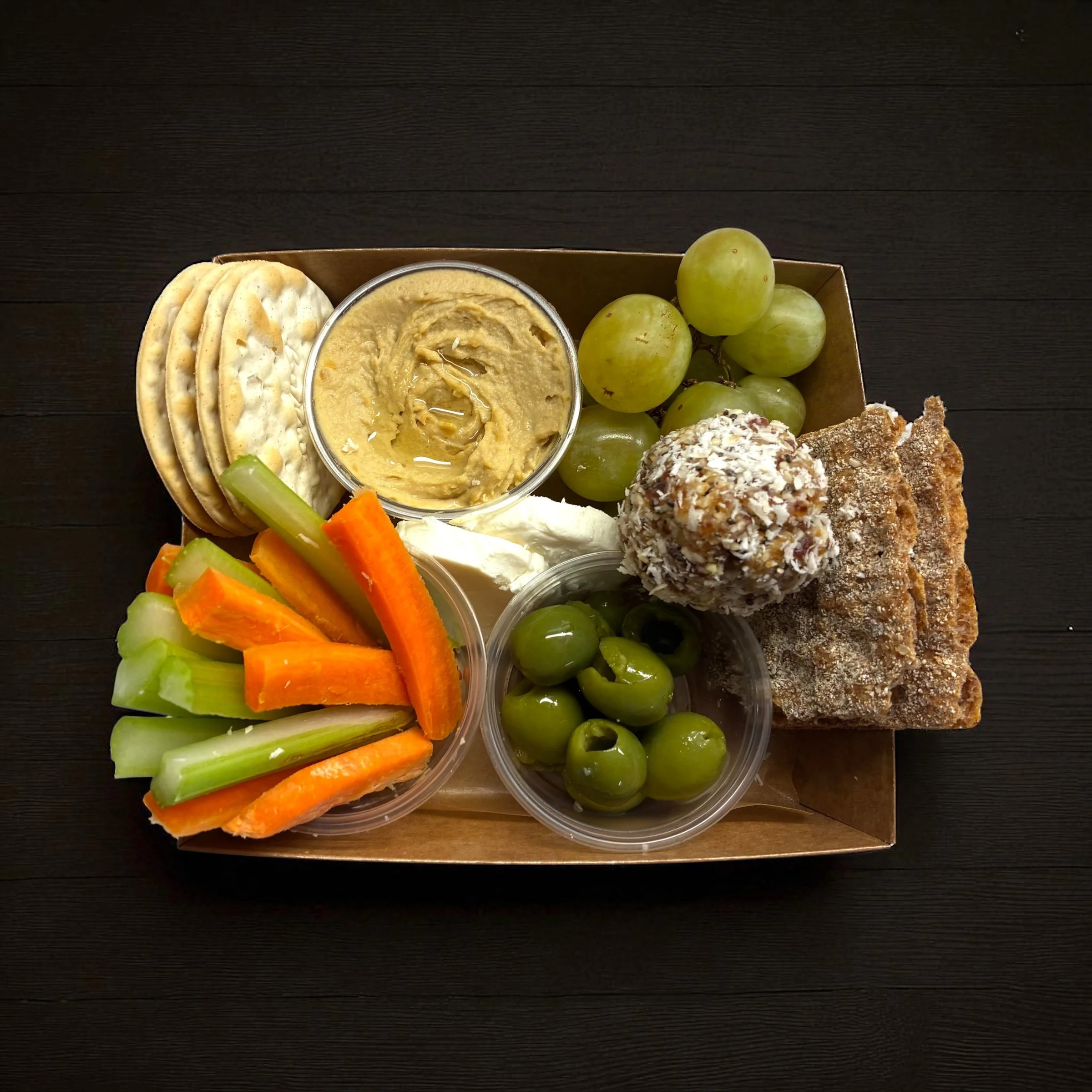 A vegetarian option named after my sister Rae-Rae. Organic hummus, seasonal fruits and veggies, something pickled, honey goat cheese and a nutrient-packed energy ball (dates, almonds, flax and chia seeds…yumm-o).
